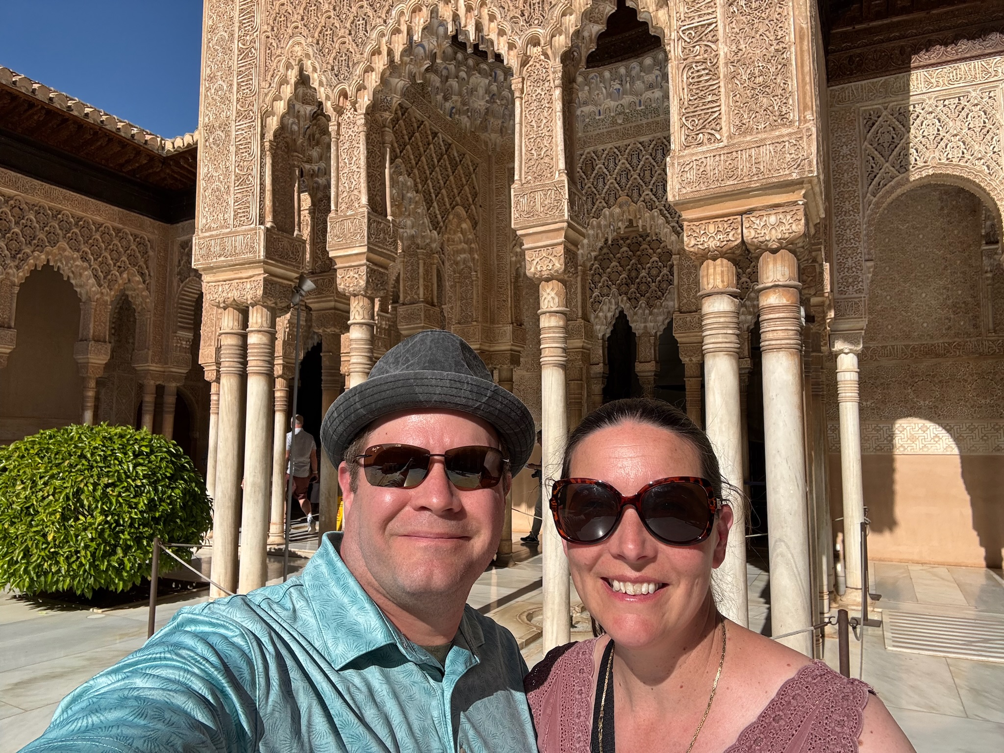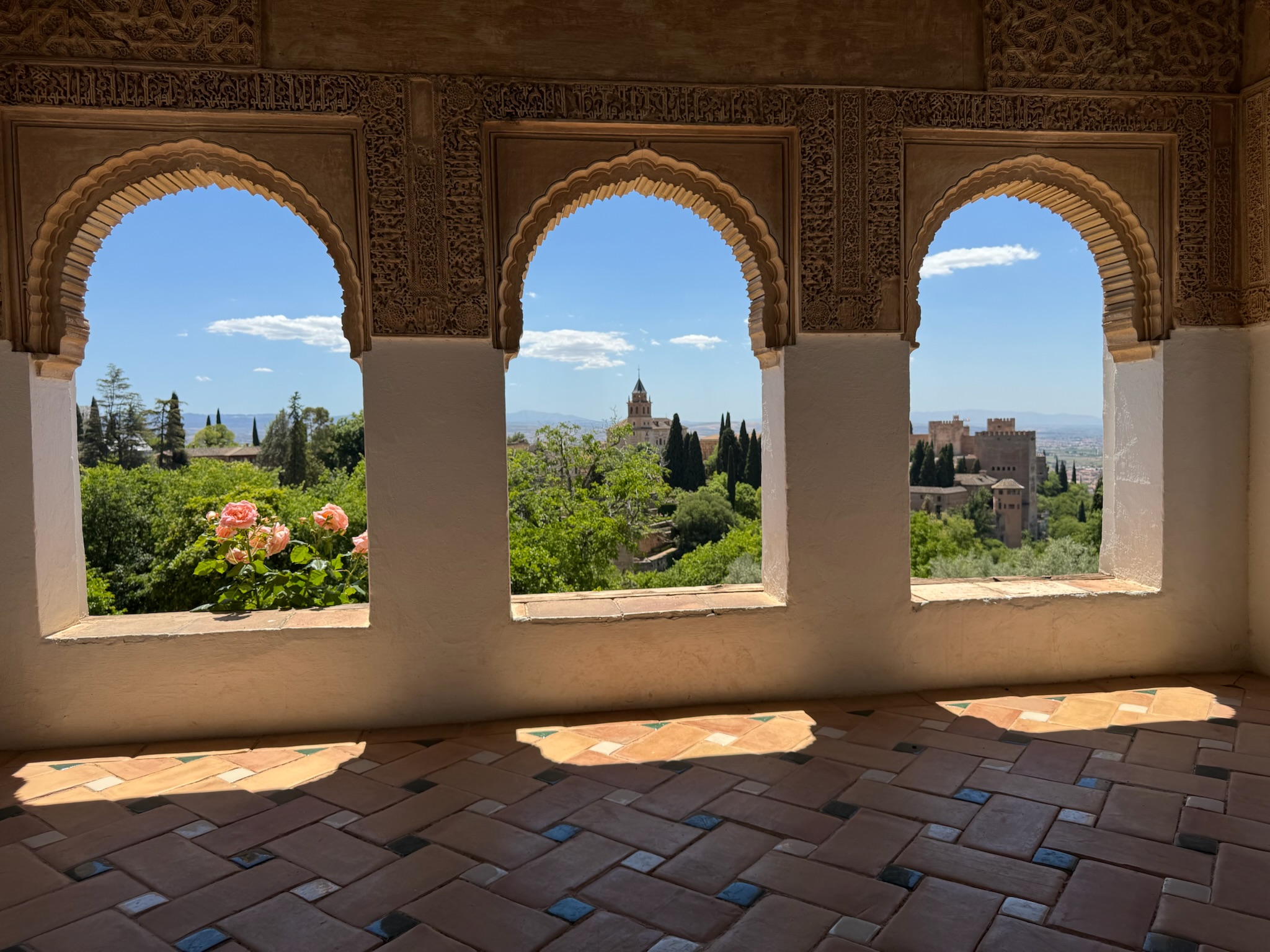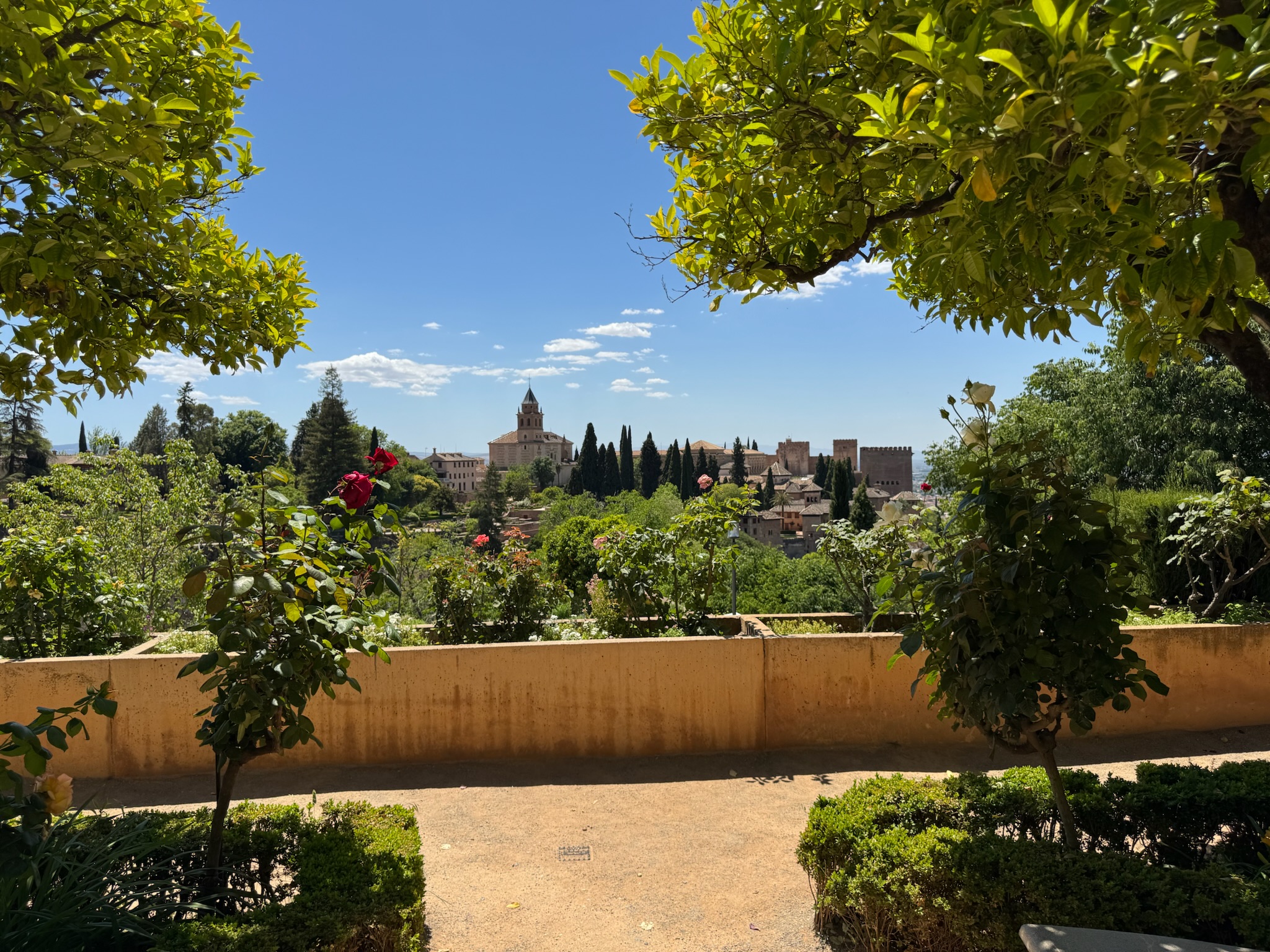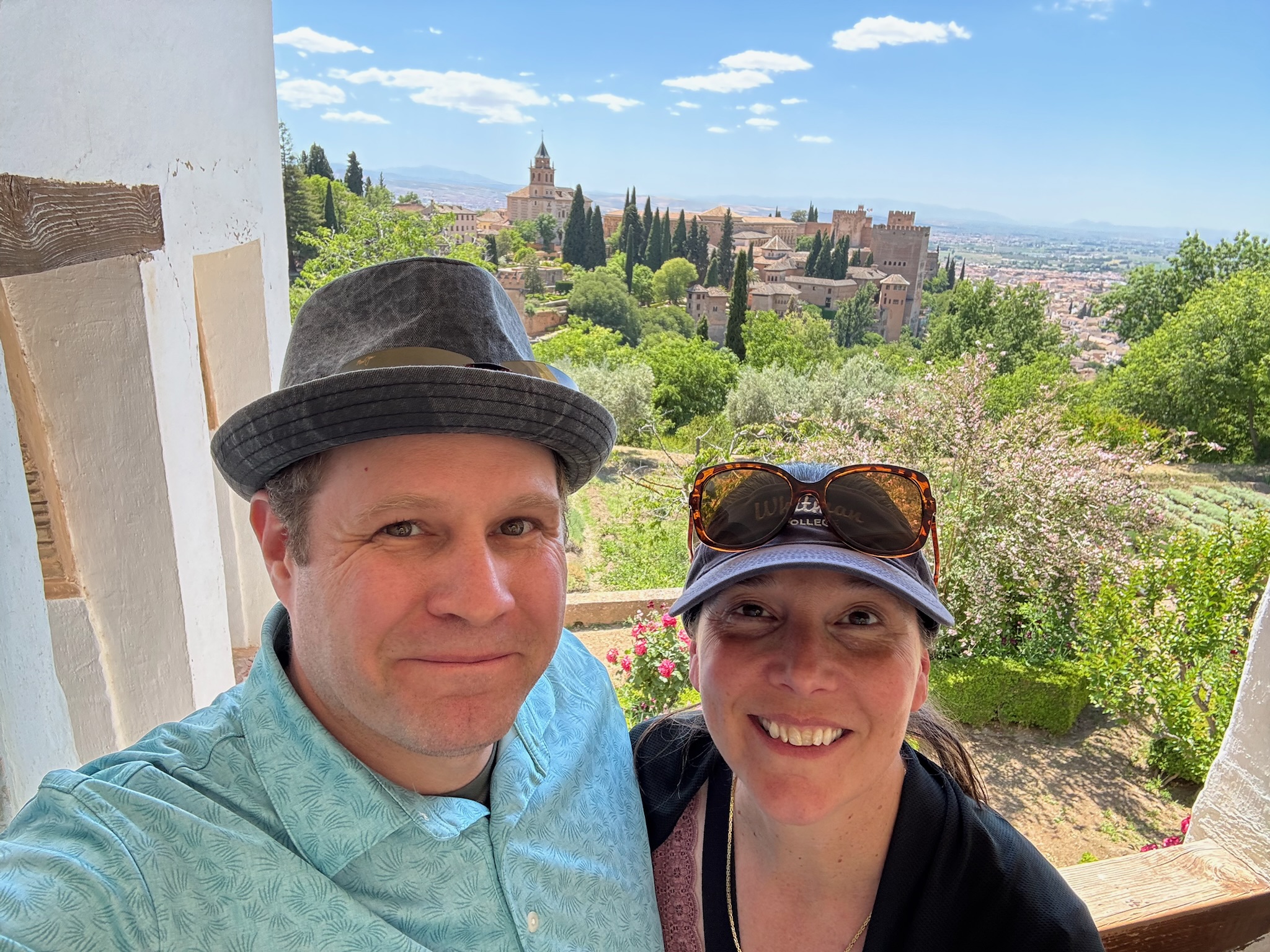 When we arrived in Grenada we made our way between white washed buildings draped with purple bougainvillea to the lovely San Nicolas viewpoint. We followed this up with reservations at a restaurant with this lovely view of the Alhambra for dinner. We loved watching the warm light of sunset hit the Alhambra. We spent most of the next day in the glory of the Alhambra's gardens and gorgeous Moorish buildings.