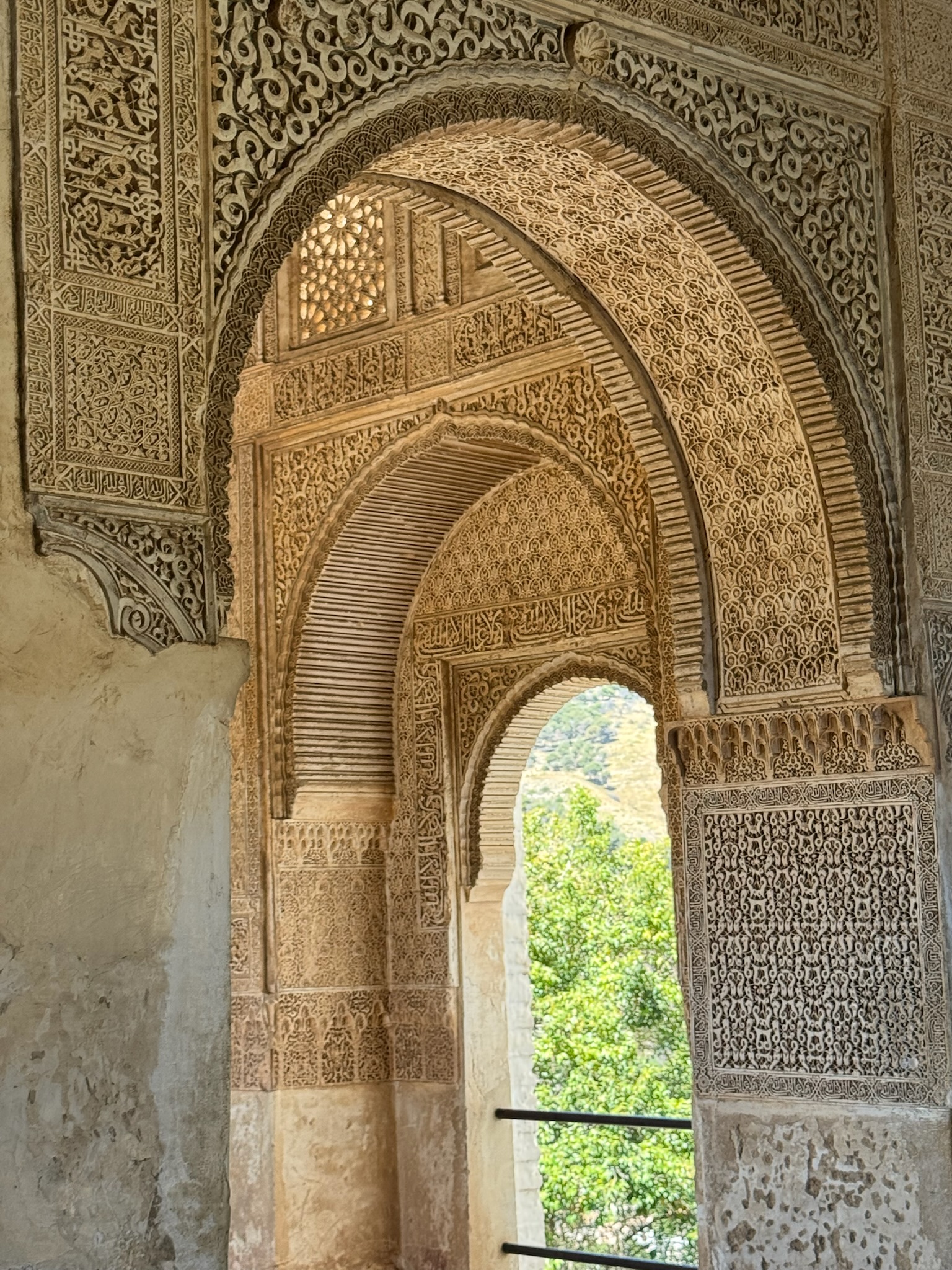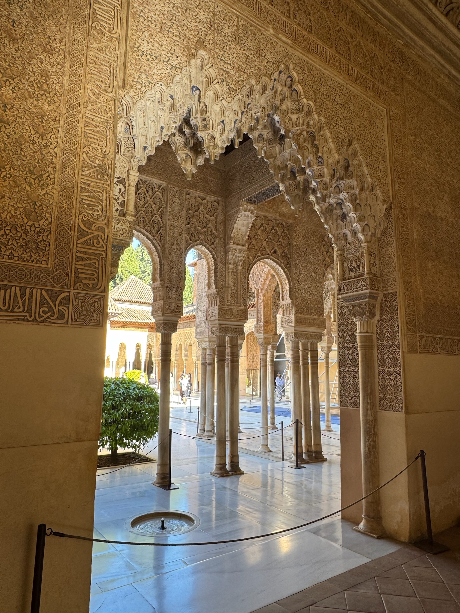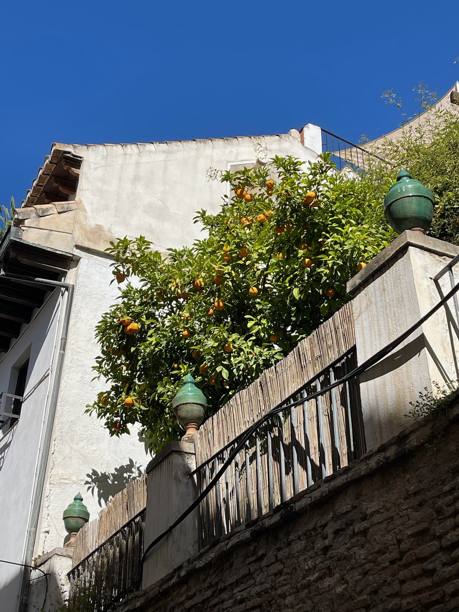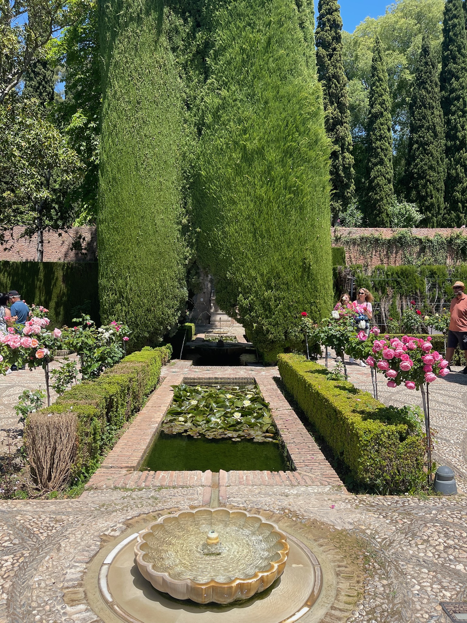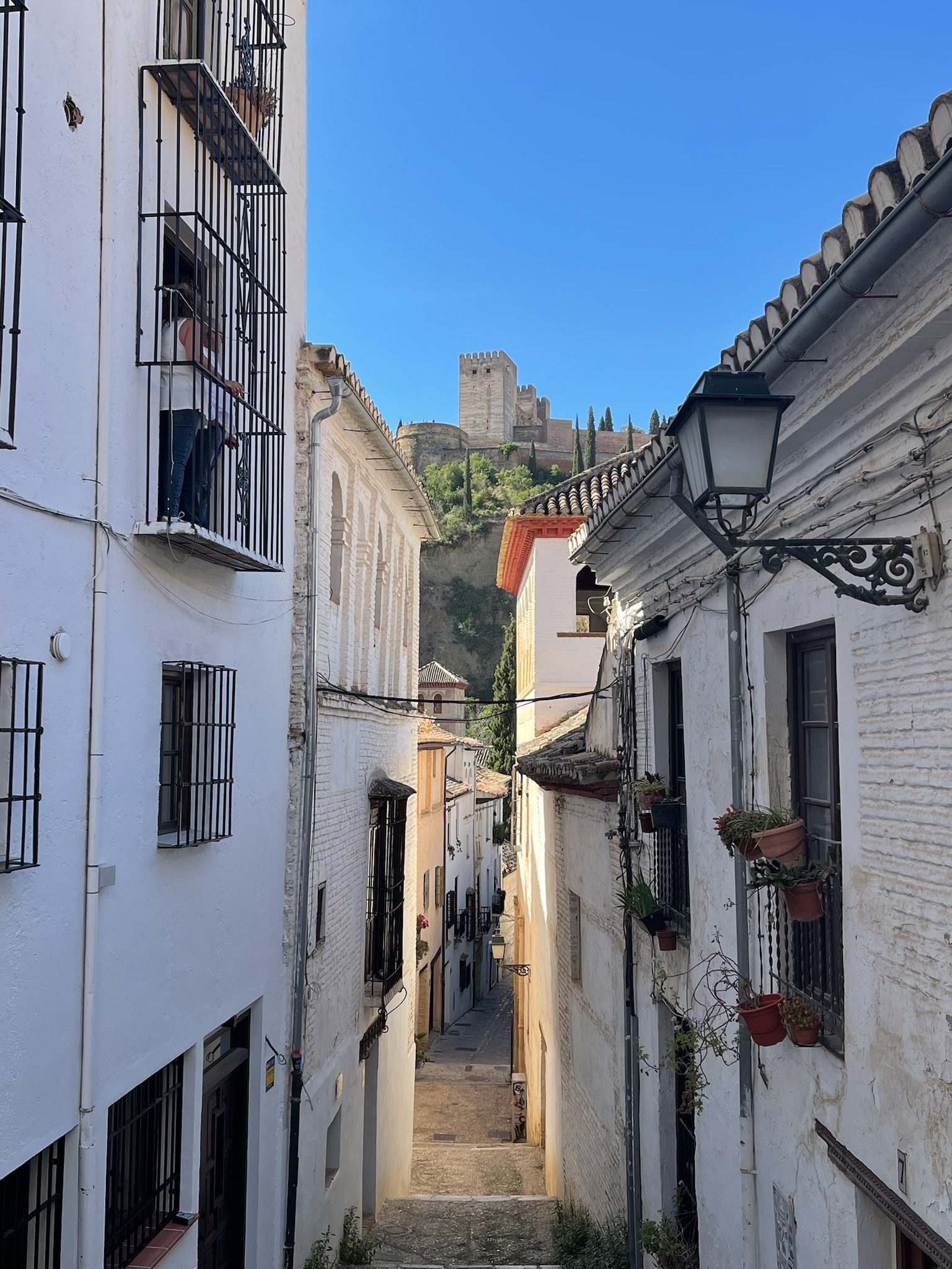 When we arrived in Grenada we made our way between white washed buildings draped with purple bougainvillea to the lovely San Nicolas viewpoint. We followed this up with reservations at a restaurant with this lovely view of the Alhambra for dinner. We loved watching the warm light of sunset hit the Alhambra. We spent most of the next day in the glory of the Alhambra's gardens and gorgeous Moorish buildings.